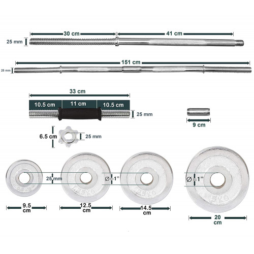 ניתן להוסיף ולהוריד משקל מהמוטות על ידי הסרה והרכבה של צלחות משקל. המוטות מצופים בכרום עם ידית מגומי למניעת החלקה.